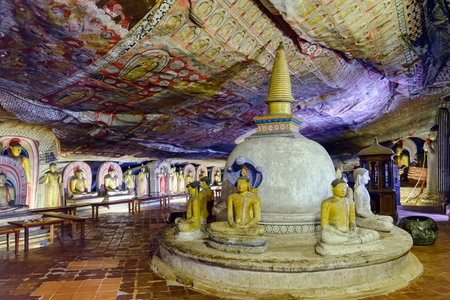 Dambulla, Sri Lanka - August 14, 2017: Interior of the cave of the Great Kings. Dambulla cave temple is the largest and best-preserved cave temple complex in Sri Lanka