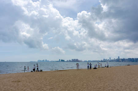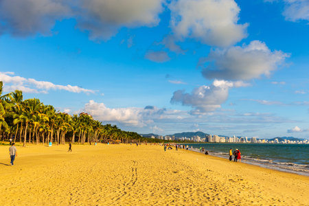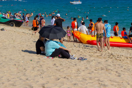 China, Hainan island, Sanya - January 23, 2020: Chinese tourists relax on the Yalong Bay beach of a popular tropical island