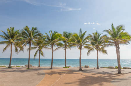 Coconut trees on the beach blown by the wind and sunlight