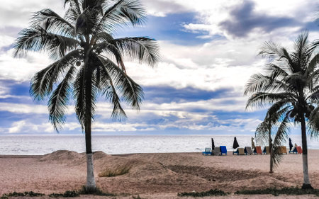 Tropical natural mexican palm tree with coconuts and blue sky background in Zicatela Puerto Escondido Oaxaca Mexico.