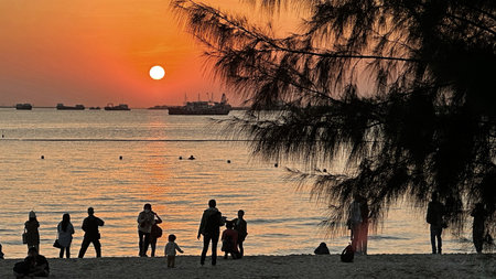 Silhouette of tree, boat, group people on beach with sun and ocean at sunset