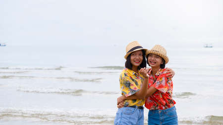 Happy two young Asian girl at beautiful beach and sea .