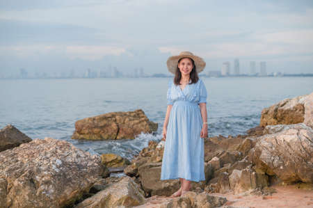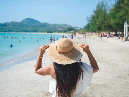 Asian woman white dress with retro hat on the beach at holiday and many people background with tree and mountain view blue ocean and sky travel concept
