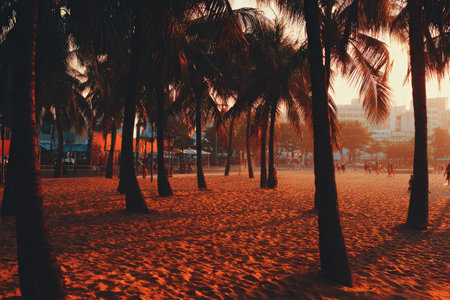 Tropical beach scene at sunset, featuring palm trees casting silhouettes on the sand. People are visible on the beach and a city skyline is seen in the background. The warm light of the setting sun gives the image a golden-orange hue.