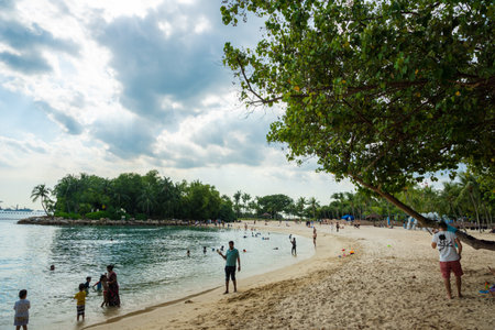 Singapore - January 2019: People at Siloso Beach at Sentosa island in Singapore. It is an artificial beach with a sand taken from Malaysia and Indonesia.