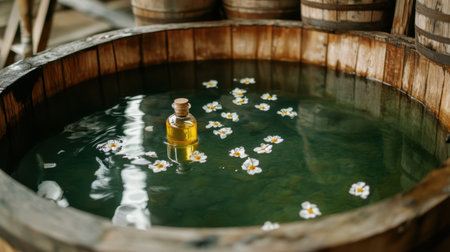 A serene wooden basin filled with clear water and delicate flowers creates a tranquil atmosphere. A bottle of essence floats gracefully, enhancing the peaceful ambiance.