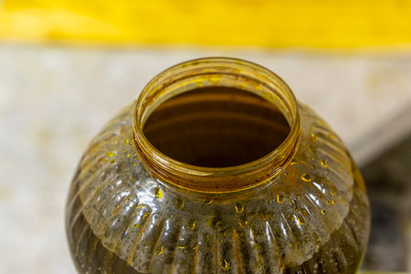 A high angle closeup shot of a glass jug on a wooden surface