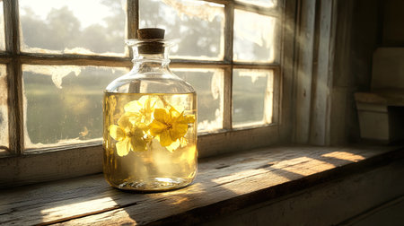 A stunning jar filled with vibrant yellow flowers sits gracefully on a wooden windowsill, illuminated by soft sunlight. The warm ambiance creates a serene atmosphere, making it a perfect addition to any cozy home setting.