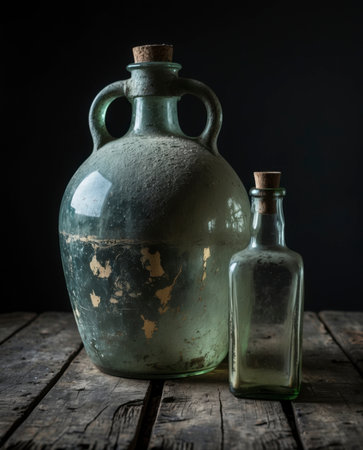 An old glass jug and a bottle sit on a worn wooden surface, their dust-covered surfaces reflecting the dim light. The aged textures and muted colors create a nostalgic, timeworn atmosphere, evoking a sense of stillness and forgotten history.