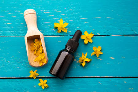 Hypericum perforatum known as perforate St John's-wort tincture or oil bottle with plant flowers for decoration on blue color wood board background. Herbal medicine concept.