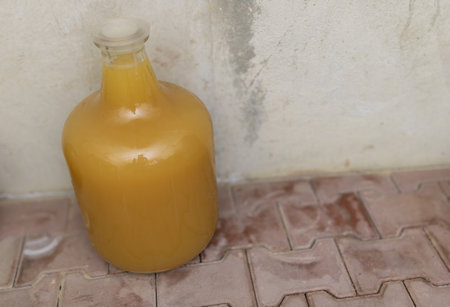 Large glass bottle filled with homemade white wine.