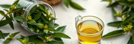 A cup of tea sits on a white table surrounded by sprigs of green leaves