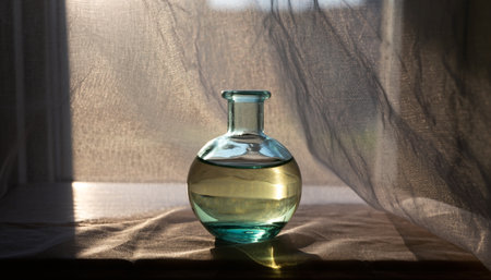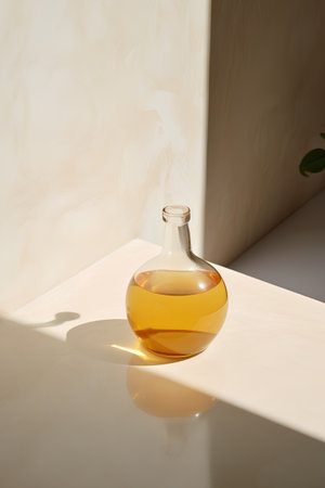 Glass bottle of oil on the table in the sunlight. Minimalism.