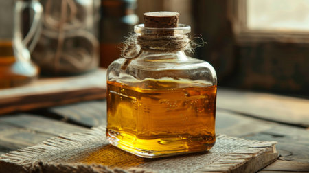 A vintage glass bottle filled with a golden liquid, placed on a rustic wooden surface with a warm, nostalgic feel.