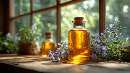 Aromatherapy oil in a glass bottle on a window background