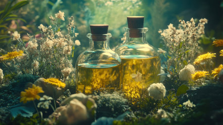 A serene composition featuring a glass jar of herbal infusion surrounded by lush greenery and sunlight, evoking calmness.