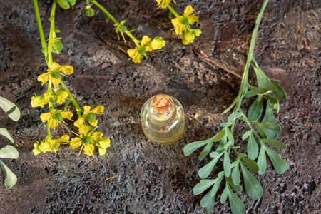 A bottle of essential oil with common rue, or Ruta graveolens flowers on a gray background