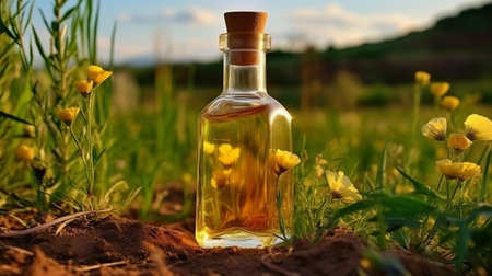 linseed vegetable oil with flax seeds and flowers, vegetarian dressing for salads and cooking and frying. health food. Generative AI