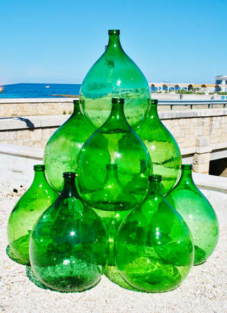 Pyramid set of vintage green glass large bottles demijohns for wine, vertical
