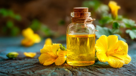 Warm yellow essence in a clear vessel, encircled by crimson hibiscus blooms, rests on aged wooden planks, evoking natural vitality and exotic allure.