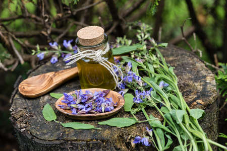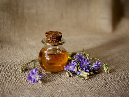 A bottle of natural aroma oil among blue flowers on burlap background. Organic cosmetic products, selective focus