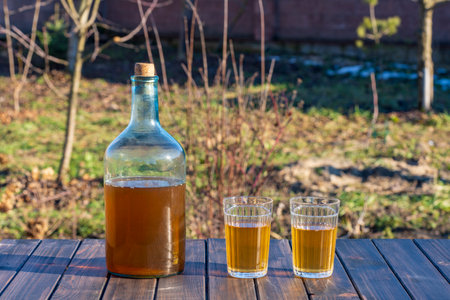 Traditional Ukrainian cold barley drink kvass in a glass jar on nature background. Kvass drink made from birch sap and fried barley. Refreshing spring drink in glass jar and glass on table in yard