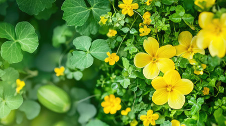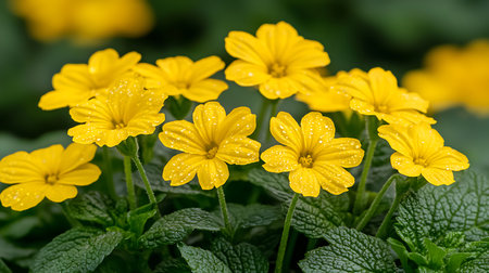 Yellow primrose flowers with water drops on petals and green leaves