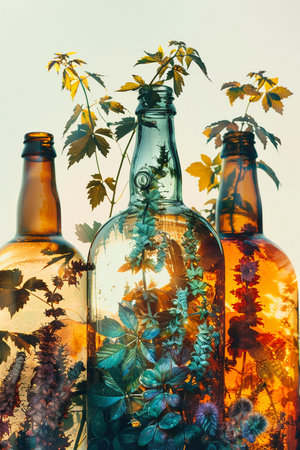 A vibrant agricultural scene showcasing lush green plants arranged around clear glass bottles, reflecting the beauty of nature and cultivation in harmony.