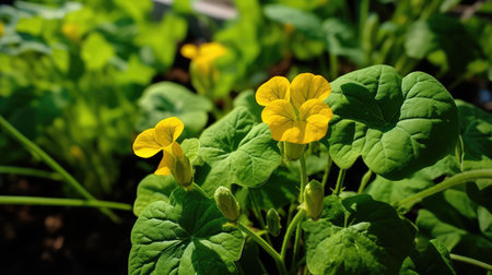 Healthy cucumber vine spreading with yellow flowers and leafy greens, ideal for showcasing organic growth