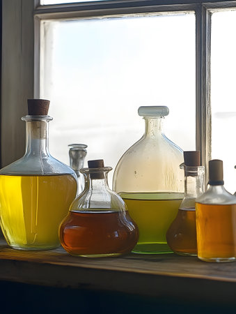 chemicals Various types of oil in bottles on the windowsill in the room