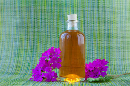 A bottle of marshmallow root tincture with Althaea officinalis flowers