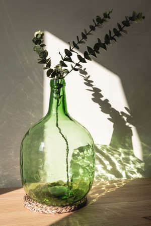 Demijohn vase with eucalyptus branches. Decorative glass vase. Interior and object photography