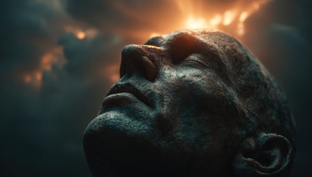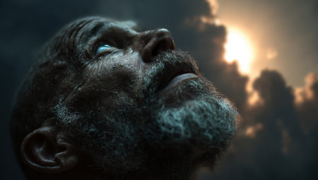 Elderly man with gray beard looks upward with closed eyes, sunlight shining through dark clouds, creating a dramatic and serene scene with deep shadows