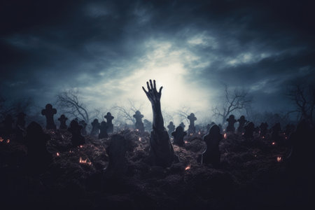 Zombie hand rising from the ground on cemetery at night, halloween concept