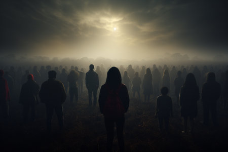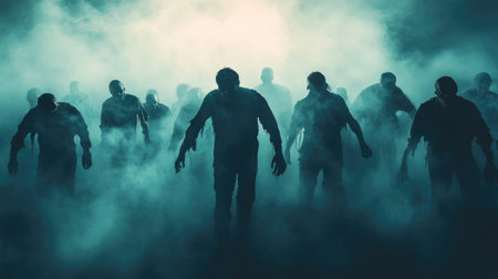 A horde of zombie silhouettes in misty fog, against a dark and eerie sky, perfect for a spooky Halloween concept.