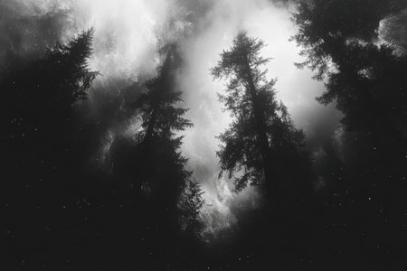A beautifully tranquil forest scene featuring the silhouettes of tall pine trees that are enveloped in a blanket of thick fog, creating a serene, peaceful, and emotionally touching atmosphere for all