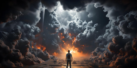 Man with an open head and closed eyes looks upward, bathed in sunlight with a dramatic cloudy backdrop, evoking a surreal and contemplative scene