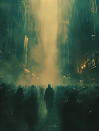 Aerial view of crowd of people walking in foggy city, Large crowd symbolizing overpopulation, AI Generated