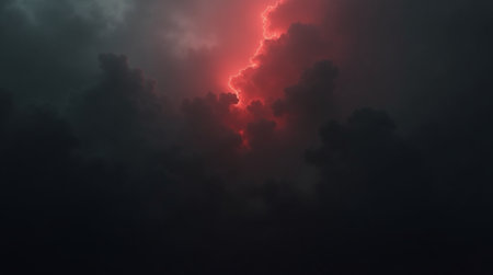 Dramatic dark clouds with a glowing red lightning strike in the center.