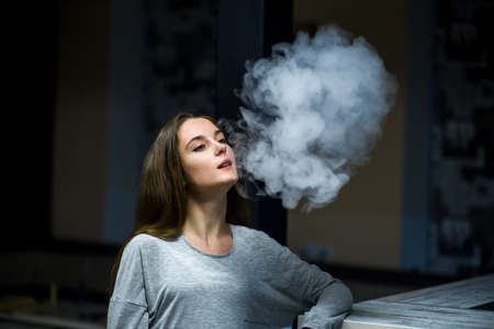 Vape trick waterfall in performance of vaper on dark background at overexposure