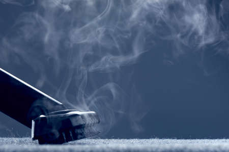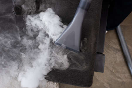 Steam close-up. Steam carpet cleaning on grey background. Home cleaning. Photo with copy space