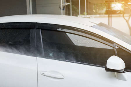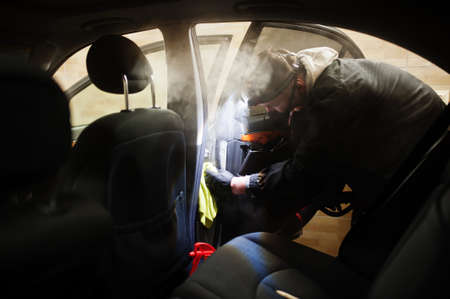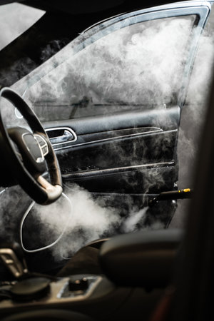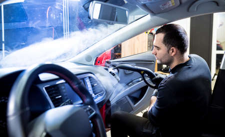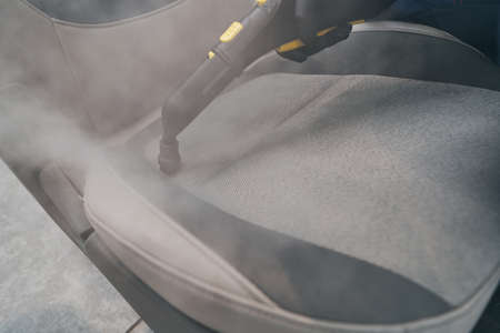 Removing stains and disinfecting car door. Cleaning and disinfecting by steam cleaner of the leather car interior