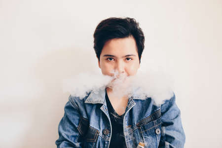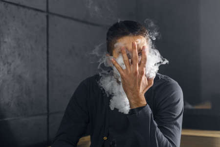 Vaping man. A cloud of vapor. dark blue background.