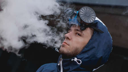 A young European man smokes a vape. Portrait of a white man in a black cap