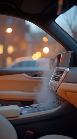 Air vent in a car emitting mist with dashboard details