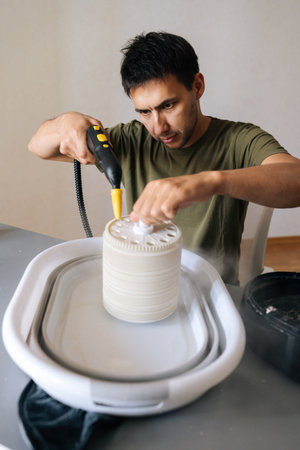 Male technician cleaning air humidifier filter with professional steam cleaner, removing dust and allergens for improved indoor air quality and home wellness. Concept of healthy lifestyle.