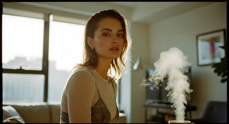 teen girl lying on a sofa, pointing at vapor from a humidifier, enjoying improved air quality and the benefits for her respiratory health in a cozy home