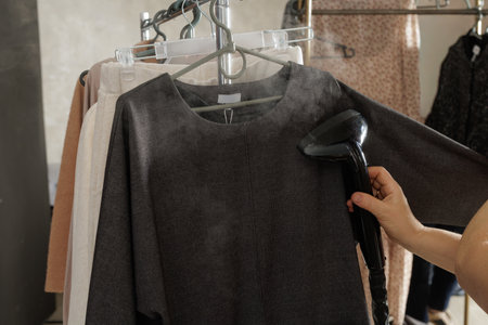 Hand smoothing a dark dress with a handheld steamer, visible vapor and wardrobe rack, ideal for laundry guides retail prep and fashion styling.