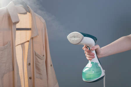 Steaming shirts in closet for garment care. Close-up on a hand using a black portable steamer to refresh shirts hanging in a wooden closet, emphasizing fabric care.