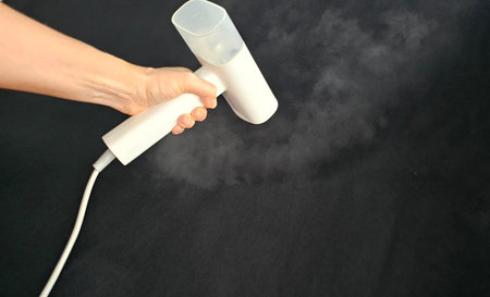 Hand holding a steamer to remove wrinkles from black fabric with visible steam rising in a home setting